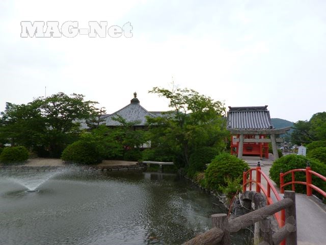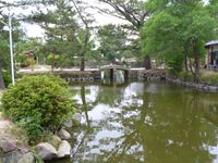 綺麗に整備された庭園には池が配置されており、その中の島に朱色の「宇賀神社」があります。