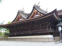 この再建で、入母屋造の屋根を前後に2つ並べためずらしい比翼入母屋造の本殿に、切妻造の拝殿をつながります。