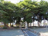 駅のそばには木々が茂った1角があり、鳥居が建っています。