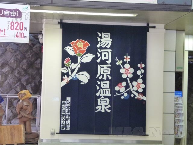 駅では、梅と椿が描かれた大きなのれんが出迎えてくれます。