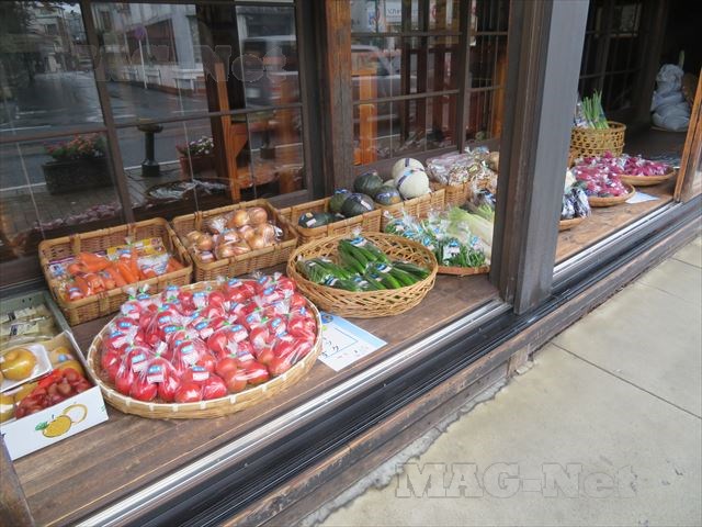 道路沿いの軒下には野菜が並べられ、売られています。