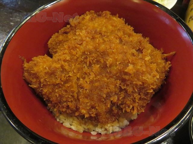 「わらじかつ丼」で、丼いっぱいにとんかつが重なりあって入っています。