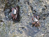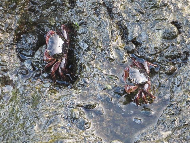 波が引いたすきに、小さなカニがソワソワと動き出します。