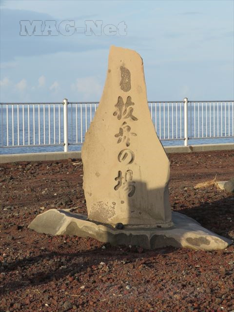 その先の海岸線に、石碑が建っています。