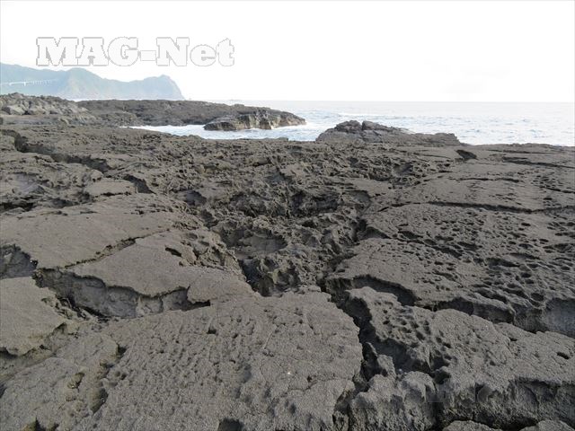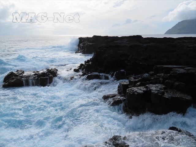 静かな波もこの岩肌に押し寄せると、ごつごつした岩のくぼみに入り込み、行き場を失って空高く白波としてしぶきを揚げます。