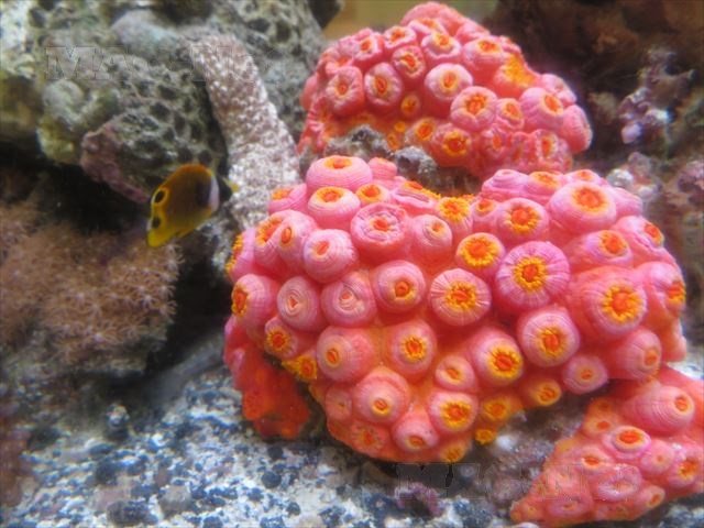 海水を満たした水槽には、サンゴの間を熱帯魚が泳いでいます。
