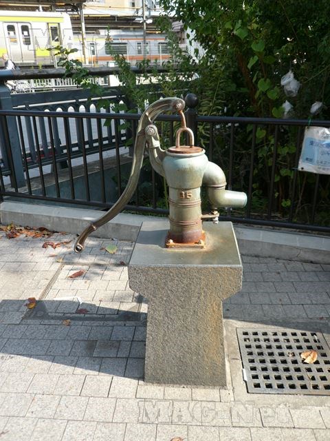 駅ロータリーに面した所には、手押しのポンプが飾られています。