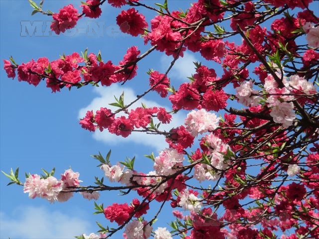 ソメイヨシノに混ざって赤い花をつける桜の木があり、その花の色が鮮やかです。