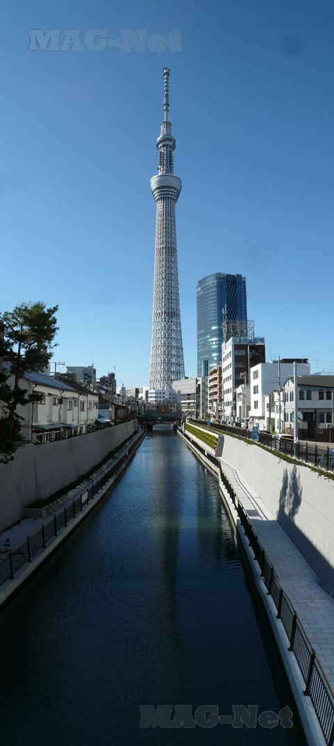 川に映るスカイツリーの影が逆さツリーとなって、本当のツリーと重なり面白い映像を見せてくれます。