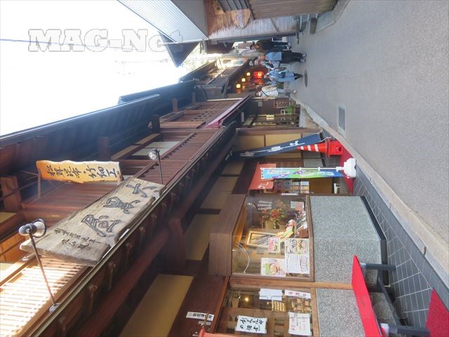 坂の両側は、観光のための土産物や食べ歩きのための様々な店が並んでいます。