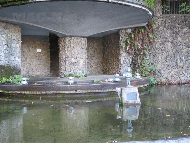 本来ならば滝のように水が落ちる背景のはずですが、訪れた時には水が流れておらず何か物寂しい感じがしました。
