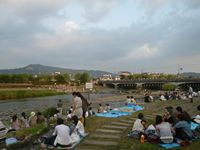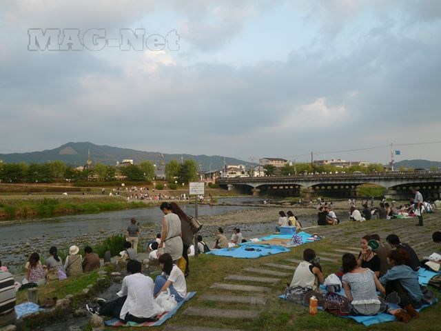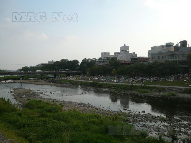 賀茂川の西側堤防では、中州にも増して人が集まっています。