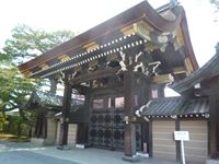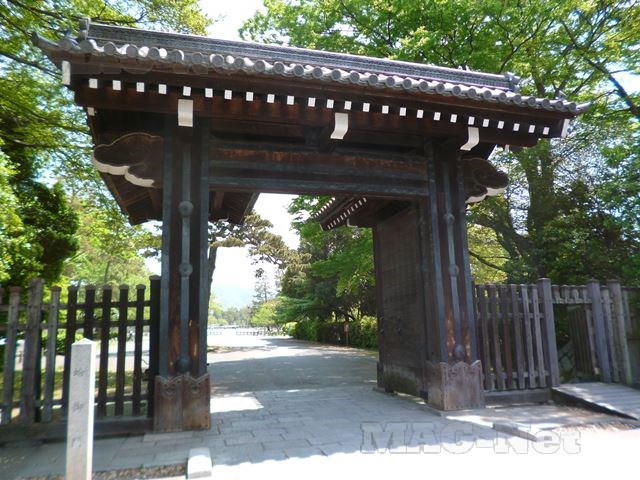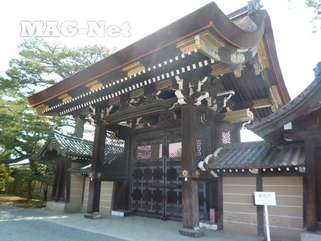 御所の正門に当たるところで、外からは黒光りする年季の入った門ですが、中から見ると金色の混じった立派な門です。