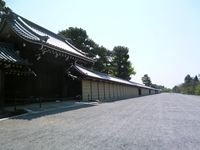 「京都御所」の周りには「京都御苑」が広がり、緑豊かな公園を砂利の敷かれた広い通路が走っています。