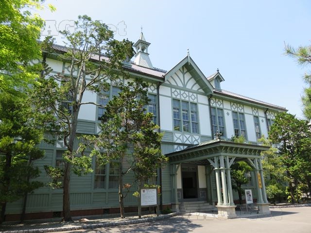 大学の正門前にあるピンク色の小さな建物は昔の交番で、今は観光案内所になっています。