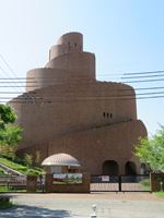 「木津南排水池」は、カタツムリの殻のような螺旋状のようで頂点は逆向きの渦巻きになっている、奇妙な形をした建物です。