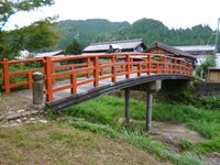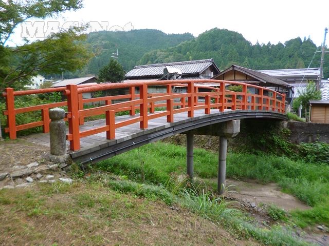 朱色の欄干を有する「もみじ橋」を渡り、参道の坂道に差し掛かります。