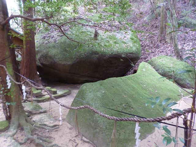 苔むした前伏磐、前立磐、後立磐の3つの巨石の前に、しめ縄が飾られています。
