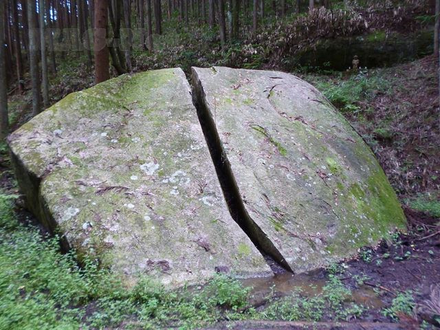 大きな石の真ん中に真一文字にひびが入り、石が2つに割れています。
