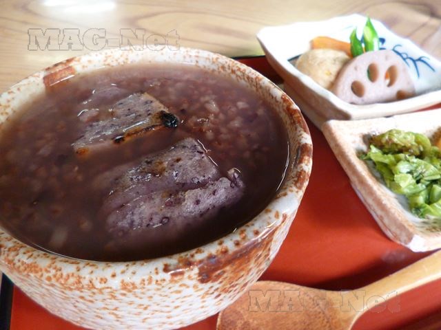 「茶粥」は古代米を使っており、赤米と黒米に茶が注がれています。