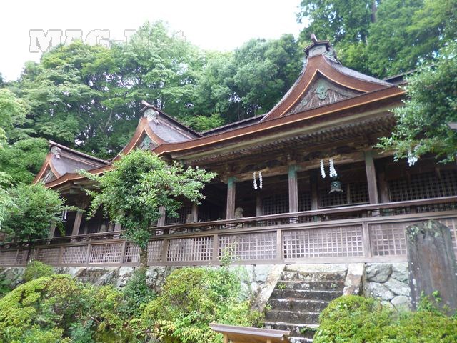 一段高くなったところには、左右を三間社流造りの建物に挟まれた中央に、一間社春日造りの本殿があります。