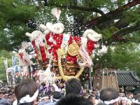 こまの付いた木製の戦車ともいえるだんじりを、わざと速度をつけて角を曲がる「やりまわし」が最大の見ものです。