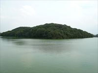 途中にある池の中で浮かんだ島ような古墳は、御廟山古墳です。