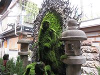 参拝者が願いを唱えて水をかける不動明王は苔生して、「水かけ不動」の名で親しまれています。