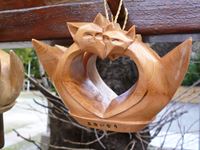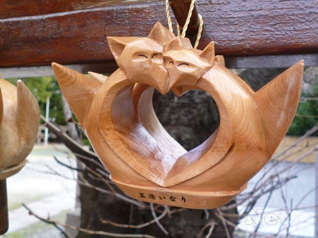 つがいのキツネが頬寄せ合っている彫刻ともいえる御札は、挙式後に一生相手を変えないと願って奉納するものです。