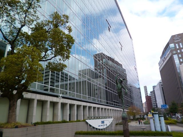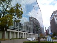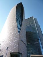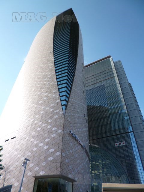 天満橋駅の交差点には、ガラス張りの巨大ビル「大阪マーチャンダイズ・マート」があります。
