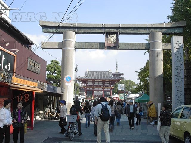 「四天王寺」を出た鳥居の前には、参道沿いに和風の建物があります。