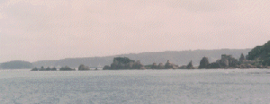 串本の海岸から大島に向かって数十の岩が一直線に並んだ岩の集まりで、何回見ても感動ものです。