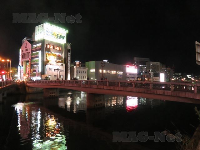 そして「旧福岡県公会堂迎賓館」横の那珂川では夜景を眺める遊覧船が出ており、案内のアナウンスが流れています。