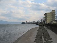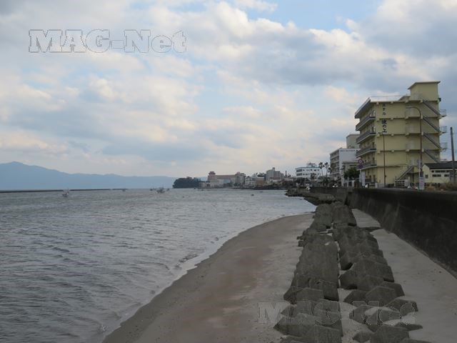 海に向かって右手の南側には、摺ヶ浜温泉の建物が見えます。