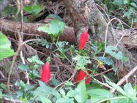 途中に真っ赤な花びらの植物が気になりますが、やぶの中に入るとハブによる命取りになるので遠目で眺めるだけにします。