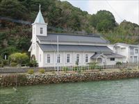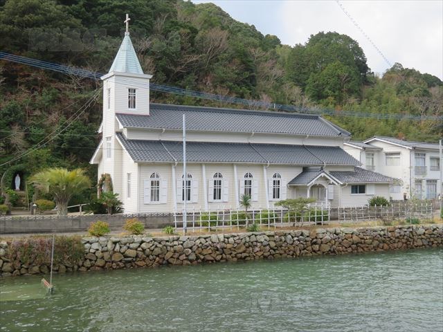途中立ち寄った「中ノ浦教会」では、入江の向こうに教会が見えます。