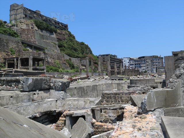 かつての地底炭鉱である「軍艦島」は、島が護岸堤防で覆われておりその上に一大都市が形成されています。
