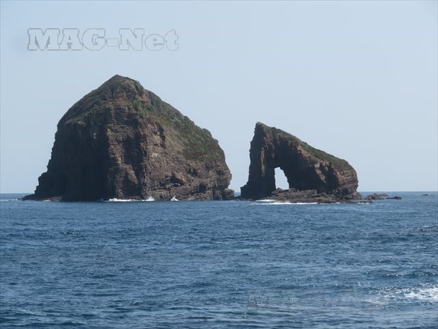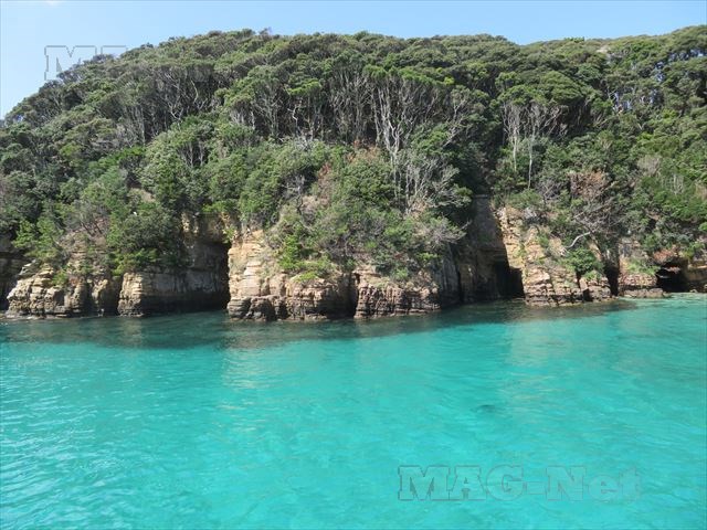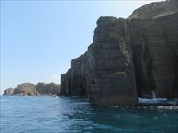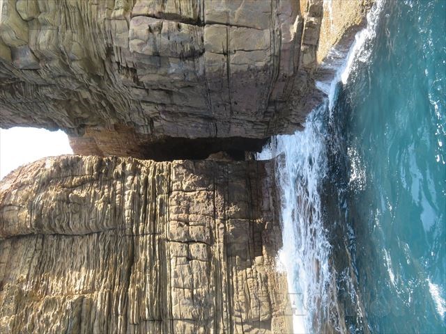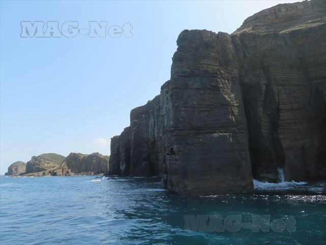 「辰の島」の北側は、波で現れた絶壁の岩肌が並びます。