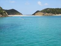 エメラルドグリーンの海と広がる砂浜です。