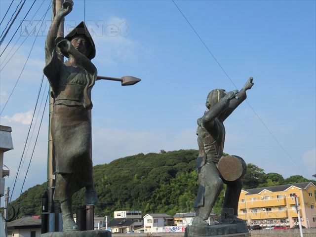 本明川に架かる「四面橋」たもとに、踊る姿をした銅像が立っています。
