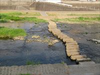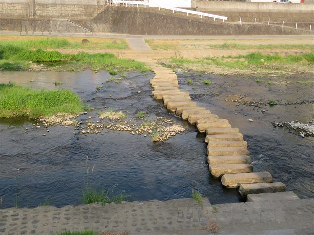 神社を出て、その前の本明川を眺めると、川の中に飛び石が並んでいます。