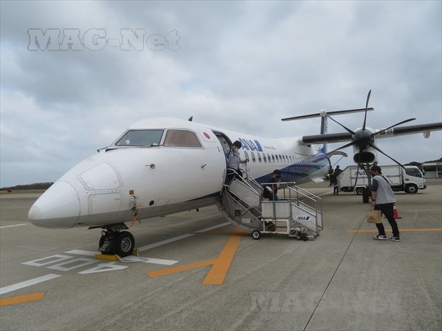 プロペラ機で、座席の真横にプロペラと着陸装置(タイヤ)が見えます。