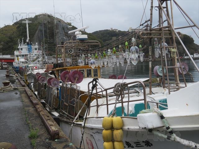 イカ釣りのランプが並ぶ船は、漁から帰ったところなのでしょう。