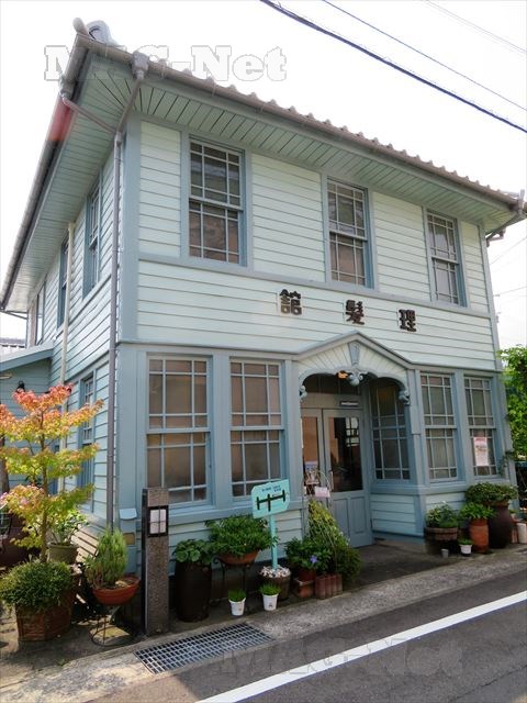 「青い理髪館」は大正時代に洋館ブームで建てられたもので、最近まで実際に理髪店として商売をしていたところです。