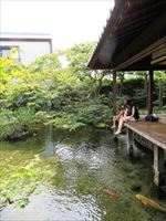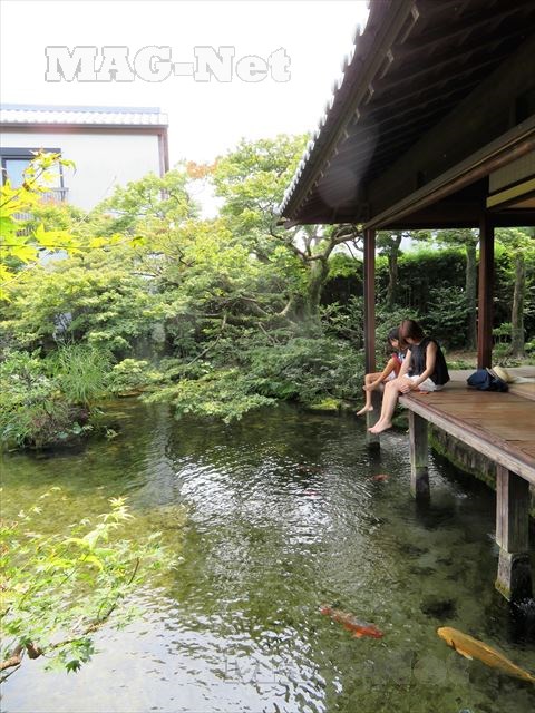 縁側では池に向かって足を投げ出し、ゆっくりすることができます。