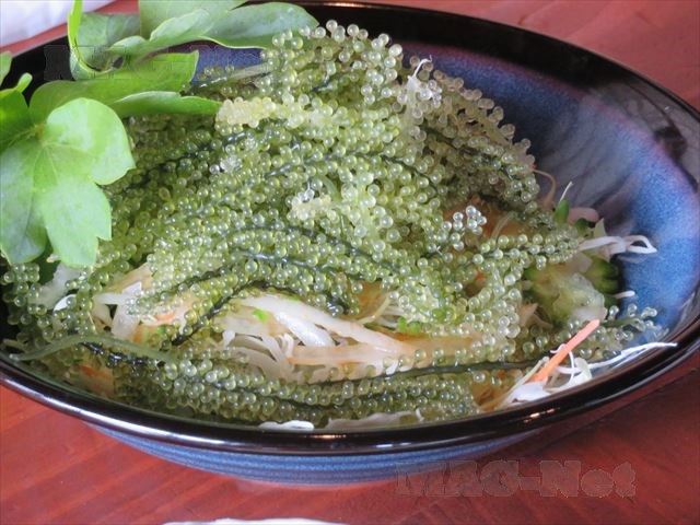 口が脂っこくなると「海ブドウ」のサラダを口に入れ、それを肉とともに「石垣島地ビール」で流し込むのです。