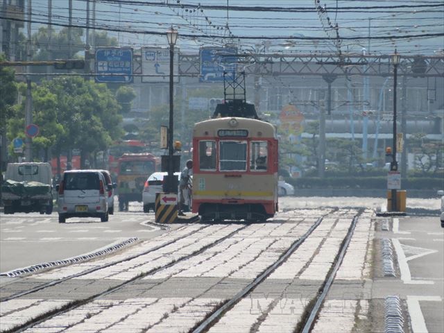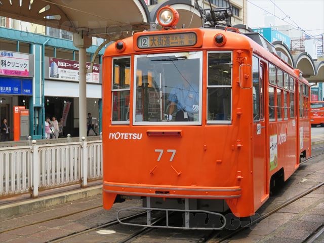 JR松山駅に降り立ち、そこから伊予鉄道の路面電車に乗り込みます。