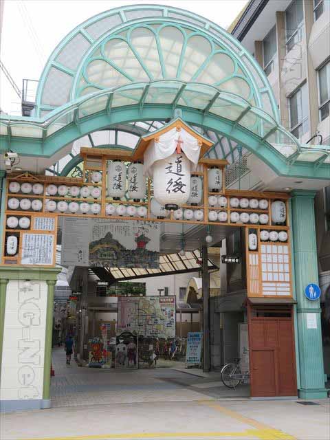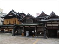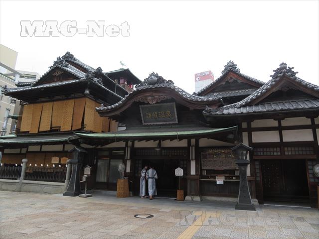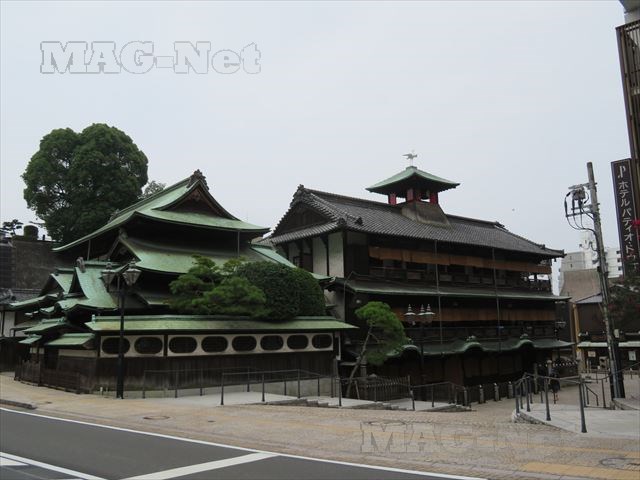 坂の下は道後温泉駅からL字に曲がった商店街の終点で、そこに大きな和風の建物があります。