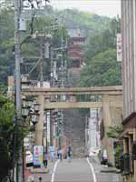 商店街入口から東側に目を向けると、長い石段の上にポツリと社が見えます。
