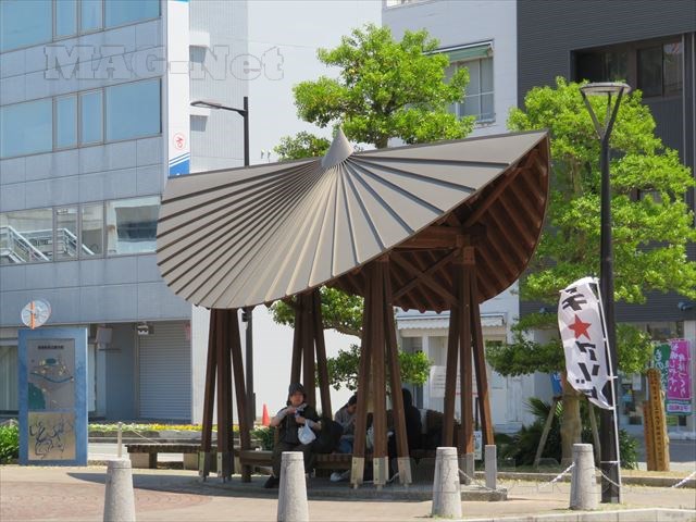 会館の前にある休憩所「へんろ小屋」の屋根も、阿波踊りで被る編み笠の形をしています。